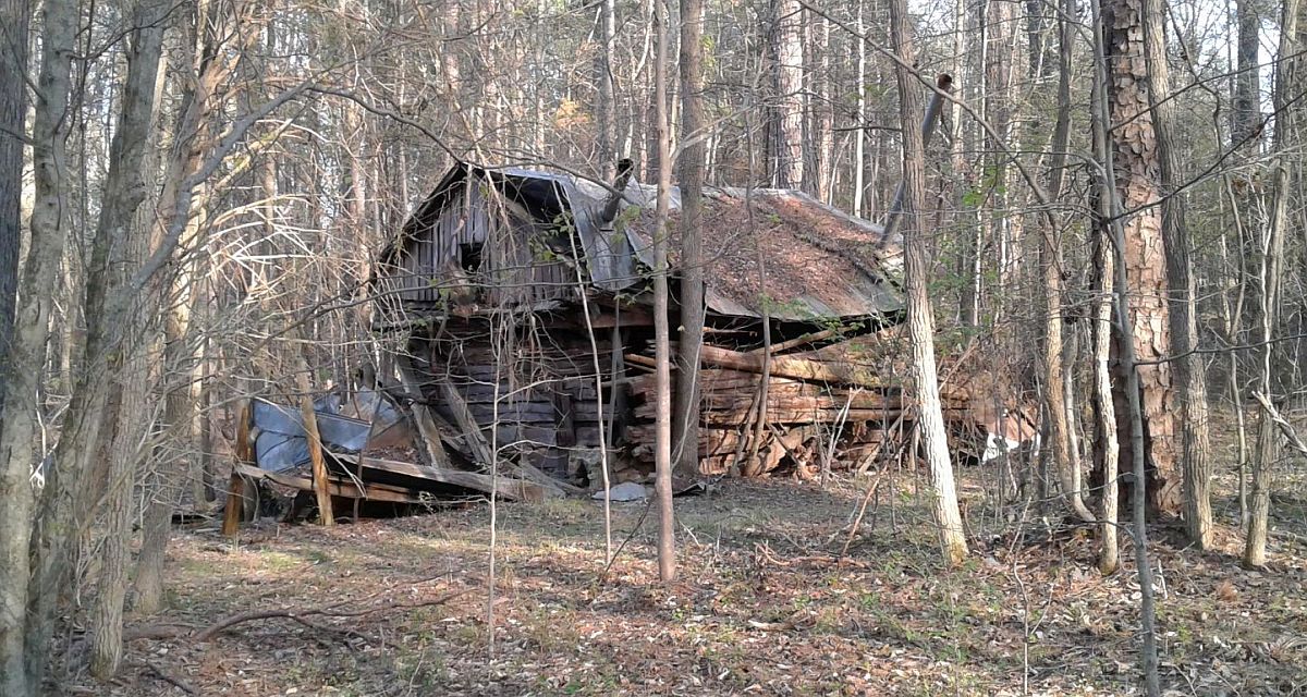 During my three-day, many-hours-long hunt for "Back from Transylvania" ( GC7MX1F ) — whose published coordinates turned out to be more than a quarter mile from its actual hiding place — I had discovered the remains of an old homestead, including a couple of crumbling tobacco barns, and explored them all in great depth. And wouldn't you know it, one of the new caches — "Tobacco" ( GC7P9Q8 ) — appeared to be at one of those barns. Friend Fishdownthestair (a.k.a. Natalie) had hunted this one a couple of days ago but had been unable to find it. So this afternoon, she and I teamed up to hopefully beat it into submission and claim the coveted first-to-find (FTF) honors.
