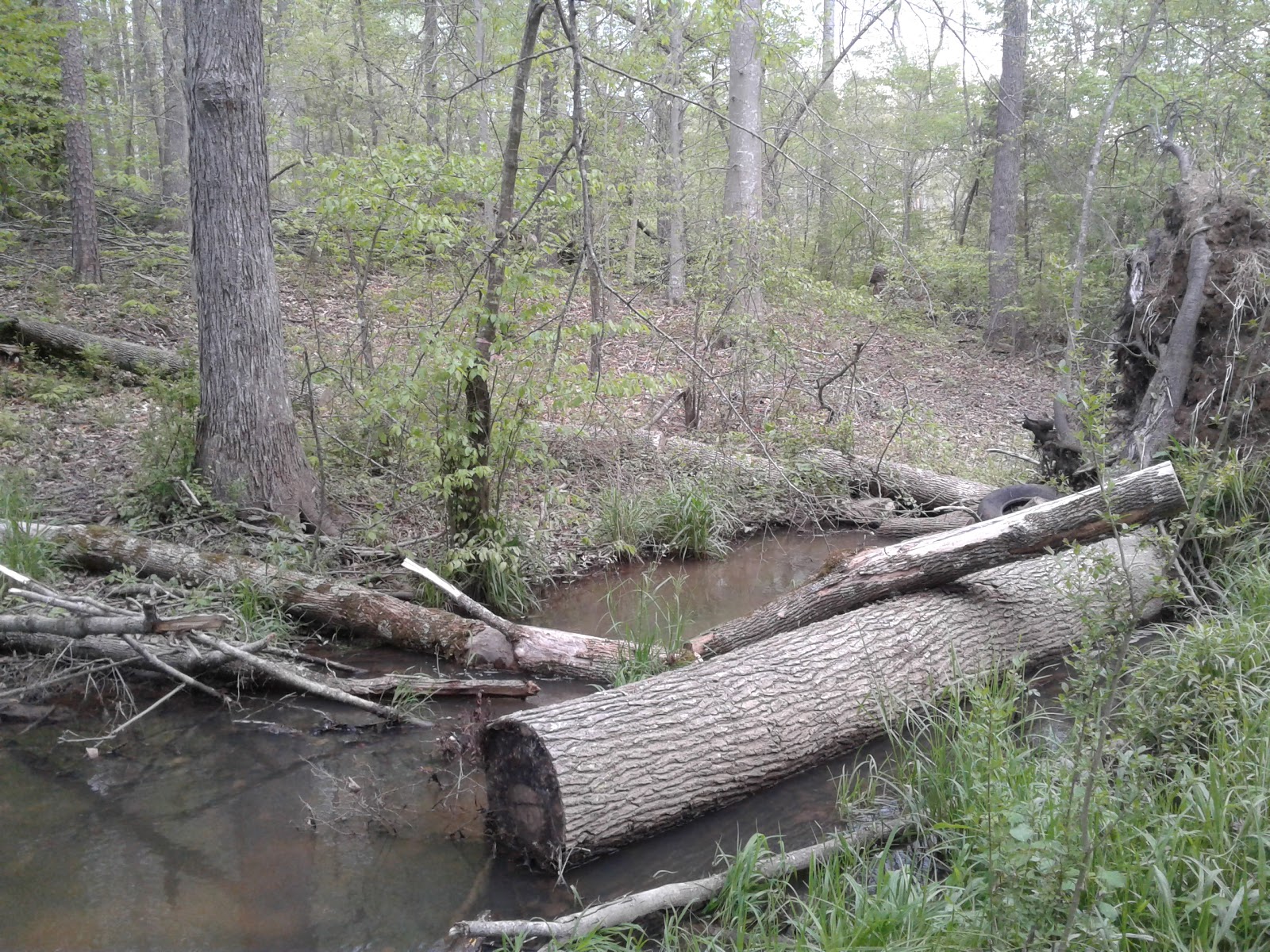It's a little damp.Today, I went more or less prepared for a good soaking, since we've had significant rainfall over the past week, but I managed to confine the muck to mostly my boots and pants legs. I did snag first-to-finds on three of the six caches out there, which is nice and everything, but the highlight of the journey was finding a rather ancient dam and some attendant ruins, which for me is one of the best aspects of geocaching. I love some good ruins, and the Company Mill Preserve is rich with them. I also had the pleasure of running into geocaching buddy Night-hawk (a.k.a. Tom) while on the hunt, and on my egress, I encountered ^c3^ (a.k.a. Chuck) and Ranger Fox (a.k.a. Christopher). Apparently, several folks were all about a good soaking today.There was a fun physical challenge too, one that could have ended up soaking me real good (or worse), but I somehow managed to escape nature's wrath this go-round. The trail on the southern side of Big Alamance Creek involves a couple of water crossings; nothing major when the weather is dry, but as it is not currently dry, it was a bit more difficult today. I did find a handy-dandy makeshift bridge — a cut log balanced on top of a larger cut log — which was a bit precarious, but it supported me well enough on my outbound trip. Coming back, however, just I was just hopping off the log into the muckity-muck, I heard a sharp crack, and when I looked back, I saw yon log had split itself into two irreparable halves. What impeccable timing, for if it had broken while I was still on it, I might have been catapulted into the next county (Randolph, about ten miles south of there). Now, the broken bridge may impede the progress of future geocaching parties, one of which I know will be attempting these caches come Saturday, so I may get called ugly names; who knows. But it was not my fault. The log just broke, is all.