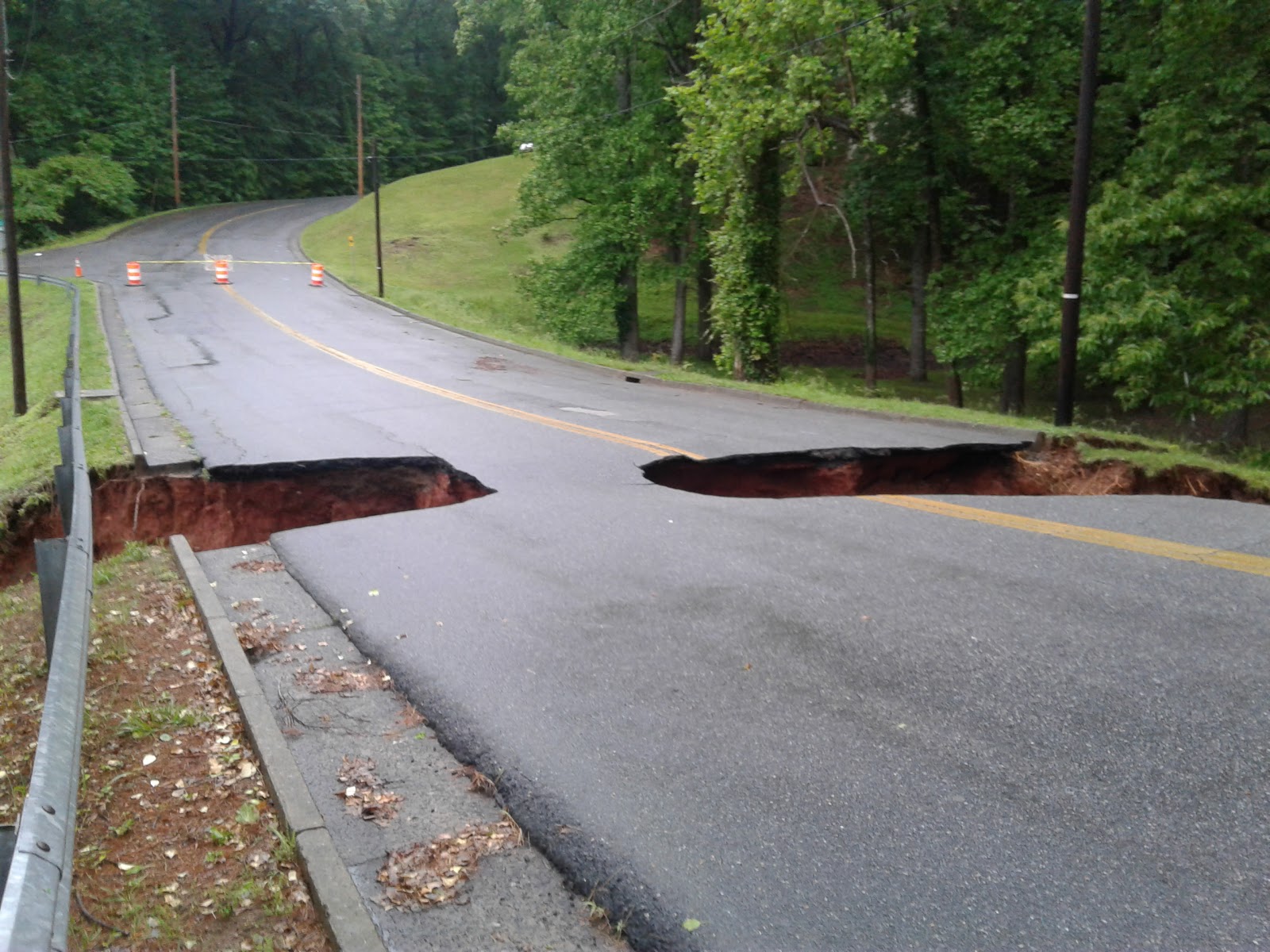 Big water just down the street. Apparently, the level had gone down a little here — from photos I've seen,it was waist-high in the middle of road.Around the corner, on Sam Lions Trail at the end of Lake Lanier, a sinkhole had opened up and taken out a thirty-foot section of the road. The massive flood had washed the huge pipe underneath a hundred feet into the lake, and as I watched from a vantage point almost too close for safety, another section of road collapsed into the newly formed gulf. The city crews had already set up a barricade, but several more soon arrived and set out additional orange cones to warn drivers away from the danger area.