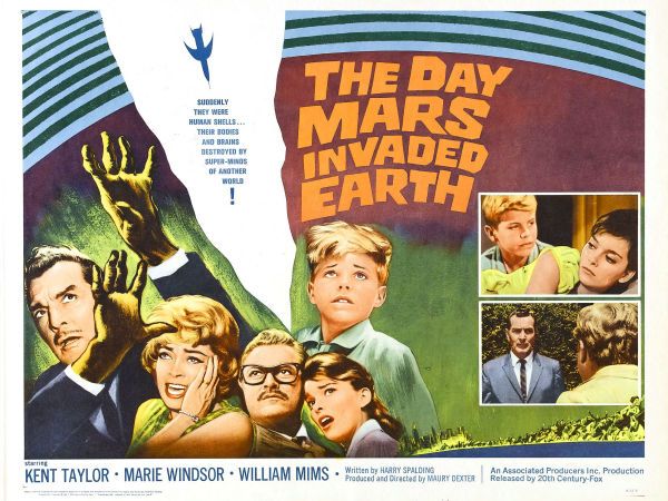 is a low, low-budget thriller, ostensibly a science-fiction film, but in mood, more akin to a spooky ghost story. It begins with a space probe landing on Mars — a dorky little motorized contraption — that bursts into flame and disintegrates within minutes of its activation. On Earth, the head of the Mars project, Dr. David Fielding (Kent Taylor) and his partner Web Spencer (William Mims) unsuccessfully try to figure out what the heck has happened to the probe. When Dr. Fielding is alone, a strange energy force appears to overcome him, but he quickly returns to normal. However, after he leaves his office, we see, seated in his chair... another Dr. Fielding.The real Fielding leaves for a sabbatical in California so he may deal with pressing family issues. His lonely, restless wife, Claire (Marie Windsor) has about had it with his work schedule and feels it may be best for them to separate. However, the kids — son Rocky (Greg Shank) and daughter Judi (Betty Beall) — are blissfully unaware of their parents' strained relationship. In the interest of preserving harmony during their sojourn in the guest house at Claire's family's estate (the Greystone mansion), Fielding and Claire decide to make the best of things.