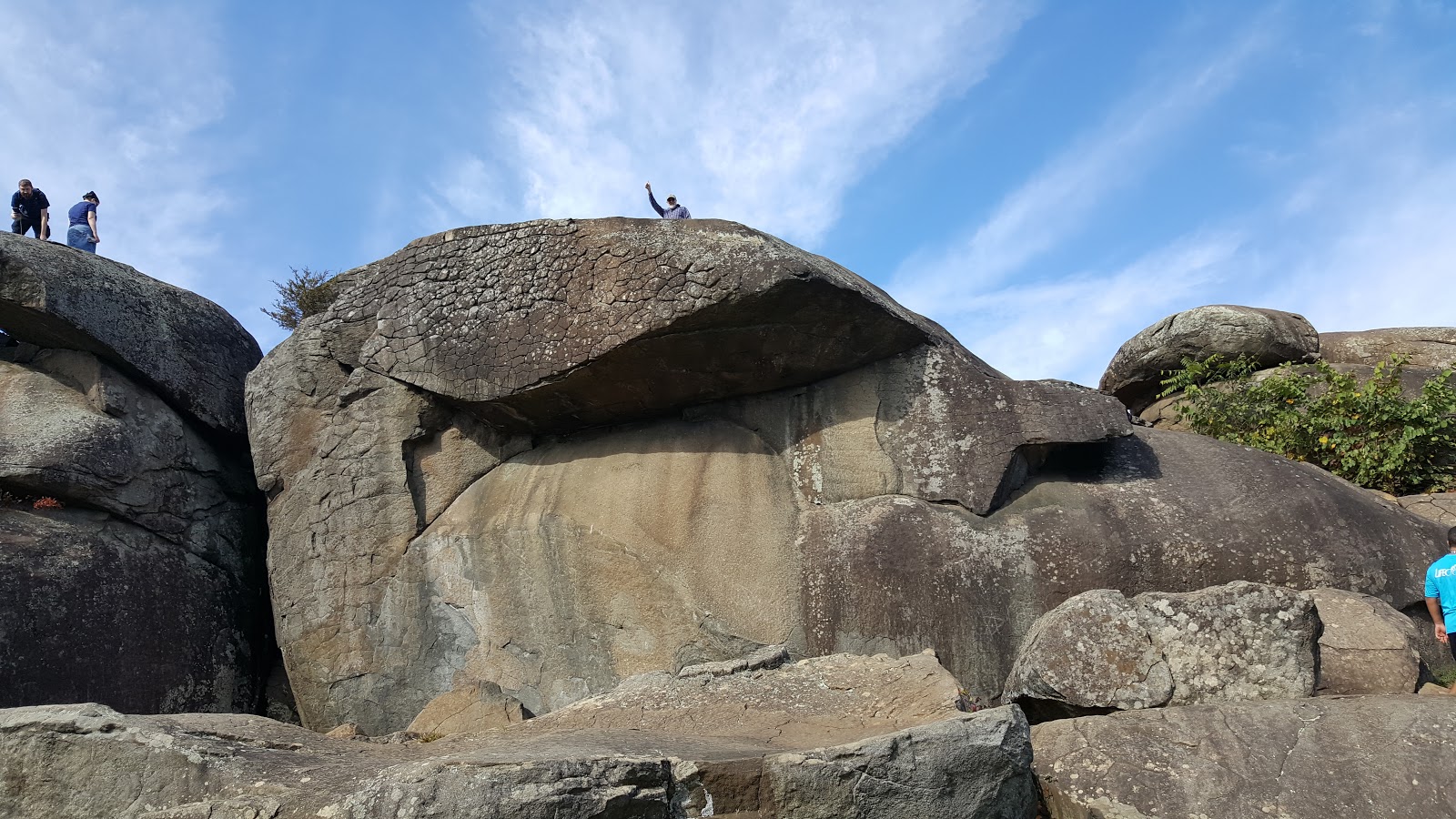 Ms. B. on the rocksAnd that hike. What a beauty! Last time we were there, the mountain was fogbound, the temperature chilly, and we were the only living souls in evidence during our entire time there. Agreeably eerie, that was. Today was somewhat different. At the trailhead, we were once again alone, though the sun was coming out, and by the time we hiked a few hundred yards we were sweating profusely. As the crow flies, it's less than a mile to the summit, but the snaking turns and switchbacks make it over a three-mile round trip, with several hundred feet of elevation change. A good workout, it is.