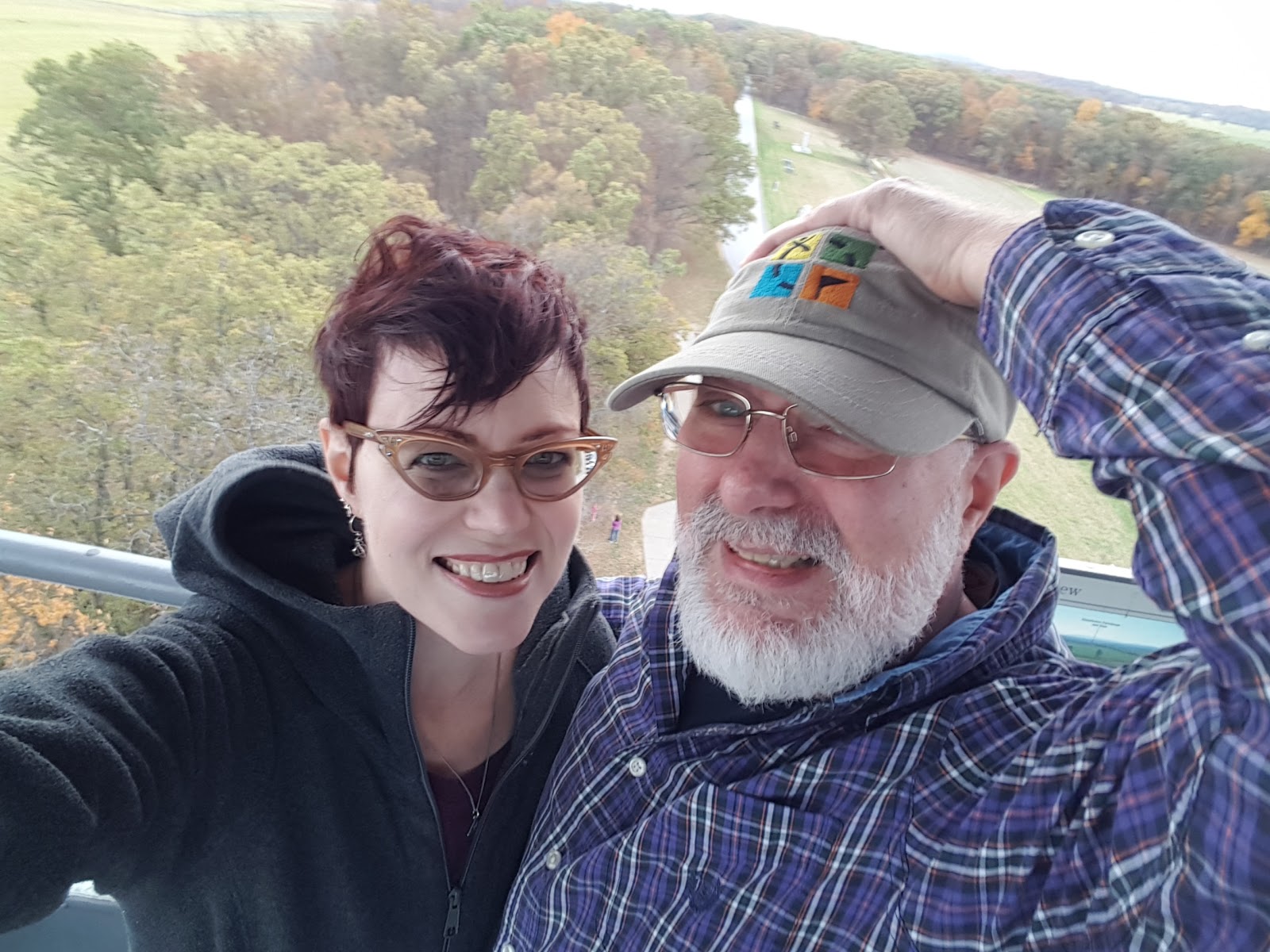 ): a 75-foot-tall observation tower that overlooks the battlefield from the west, which we climbed (with some strain on the old knees) while being battered by intense winds that had picked up during the afternoon. We spent a good while up there, enjoying the view and trying to keep from being picked up and whisked to the farthest reaches of rural Pennsylvania. Afterward, we made another climb into the higher altitudes, this time at the State of Pennsylvania monument on Hancock Avenue, along Cemetery Ridge. I did so love the views these heights afforded, not to mention all the hugs Ms. B. and I got trying to keep each other from flying off somewhere.