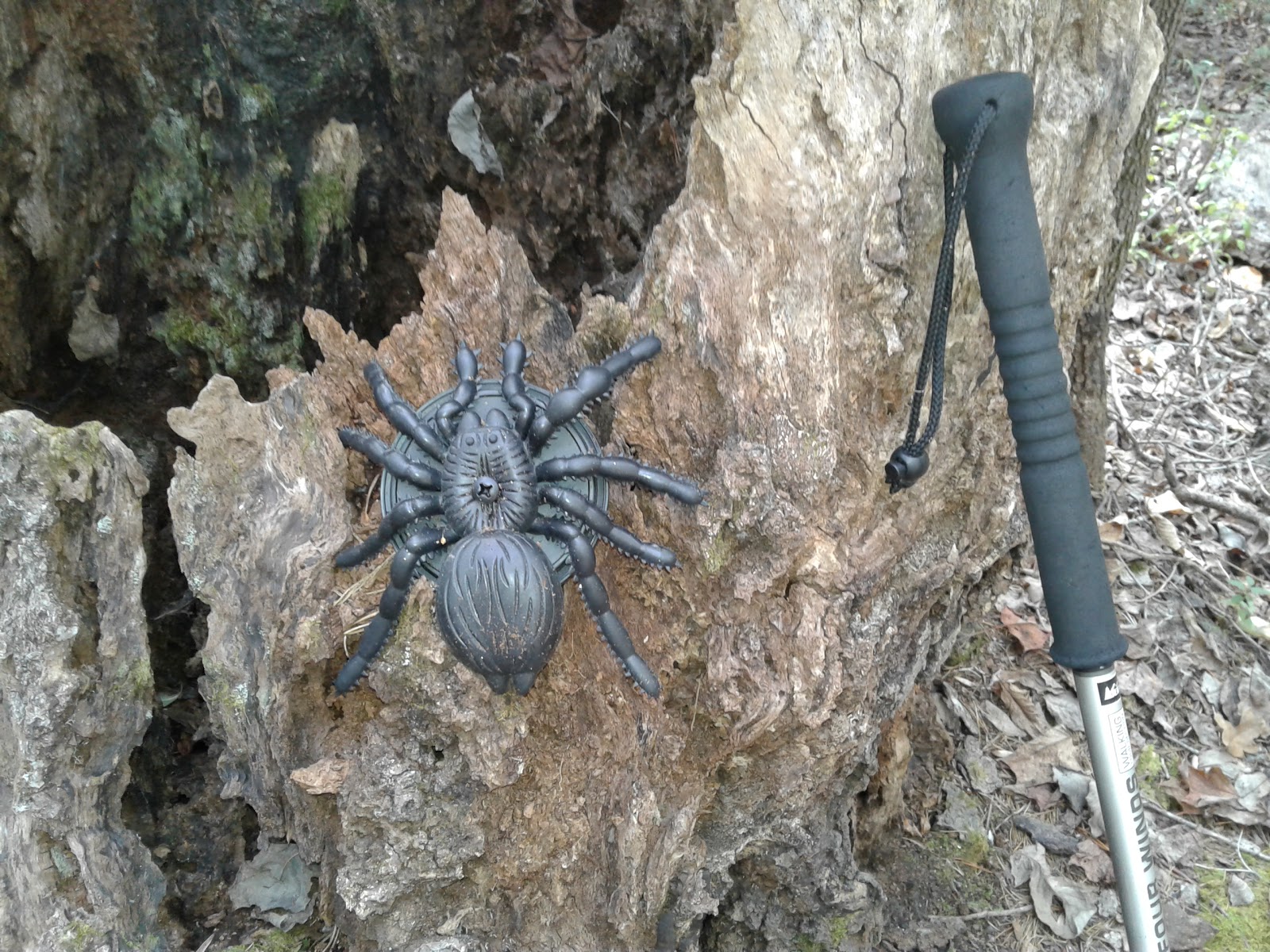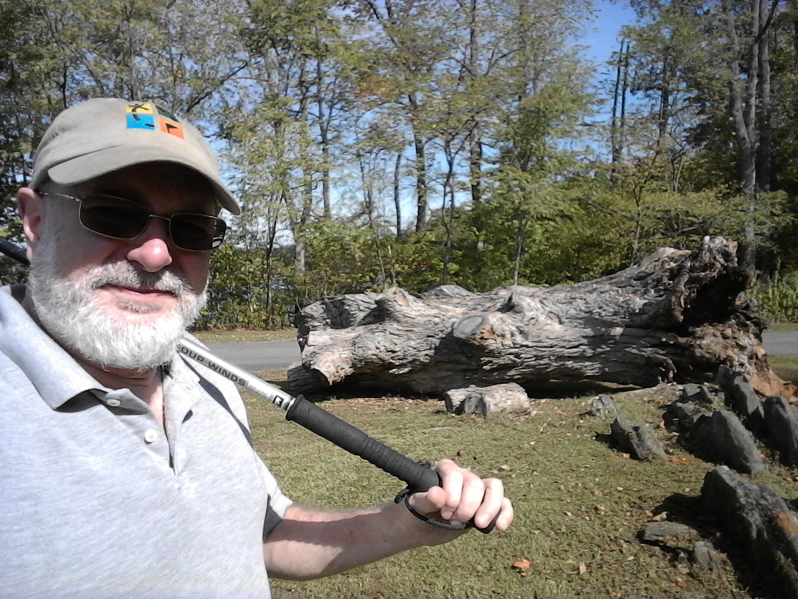 The next phase of our day's plan, however, was a bit more cardiac-friendly. After breakfast, we drove—by the most scenic and circuitous route possible—up to Smith Mountain Lake State Park , for some hiking and geocaching, where we put in several miles in everything from moderate to rugged terrain over the course of the day. I made an unexpected first-to-find at a relatively new cache—"The Turtle of Turtle Island" ( GC7D0M7 )—and found a number of well-conceived, entertaining hides, featuring props such as a deer skull hanging in a tree, a giant wolf spider, a snake, and a turtle. We also found a very old, charming little graveyard out in the woods, which especially caught Ms. B.'s fancy, since she goes for that kind of thing.