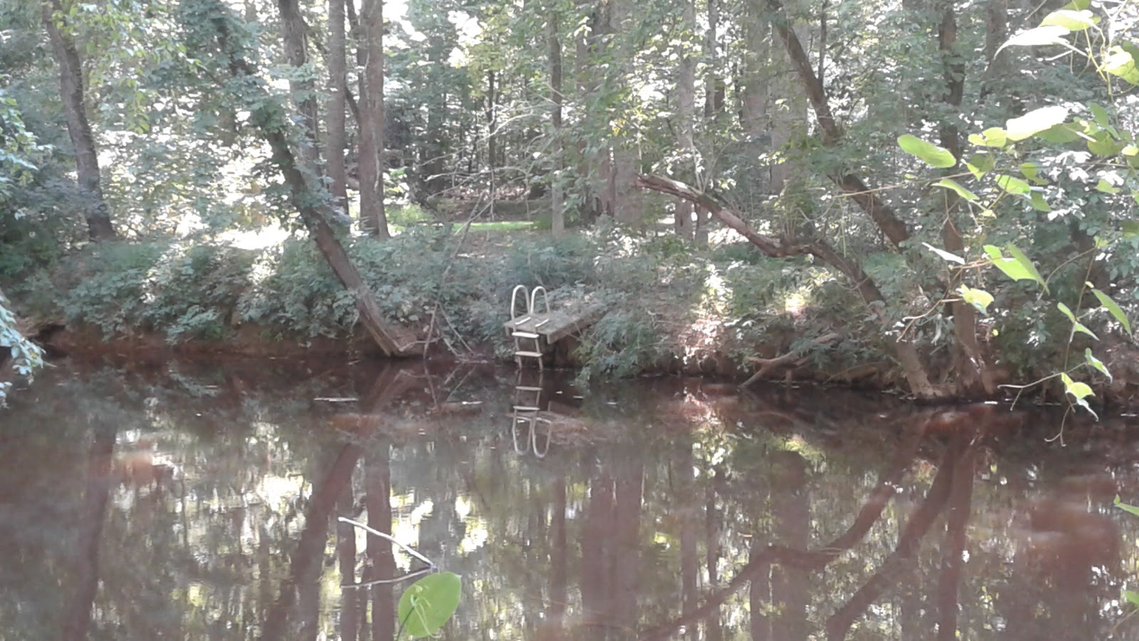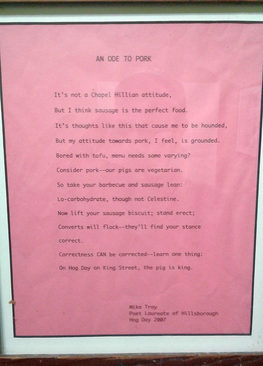 "An Ode to Pork," posted at Hillsborough BBQ Co.Another of the day's favorite locations we discovered just west of Hillsborough, on an overgown, all-but-abandoned trail at King's Highway Park , which Old Rob and I had visited some time ago hunting a number of now-archived caches. There was a relatively new one here—"King's Highway: Trestle View," GC6GWJ7 (Note: this web page is viewable only to premium geocaching.com members)—that took us to an aging, very high railroad trestle over the Eno. I believe the tracks are still active, but given the evident condition of the trestle, I'm not sure I'd want to be riding on a train passing over it.