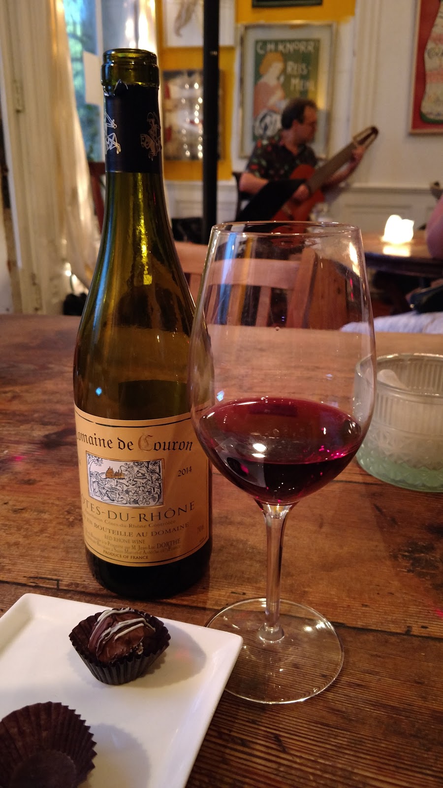 Then, while the rest of our expeditionary force checked out the local markets, I trekked a few blocks over to the Charleston Public Library, where I was able to snag a creative little geocache amid the stacks. It's a hide type I'm particularly fond of, and this was a textbook example of how to do it right ( GC1Z9Y5 ). I rejoined the group, and off we went again, soon to find ourselves at what proved to be our happiest of happy places: another wine and tapas bar called O'Hara & Flynn , where we were treated to some superb wine and delicious vittles in a gorgeous setting. From the moment we entered, the proprietor struck me as a familiar-looking chap; eventually I determined he was a dead-ringer for my old, dead friend Harry. My stating of this fact sent Beth into a fit of hysterics. Why I cannot necessarily say, but as my late friend had a warped sense of humor, I am certain he would have approved.