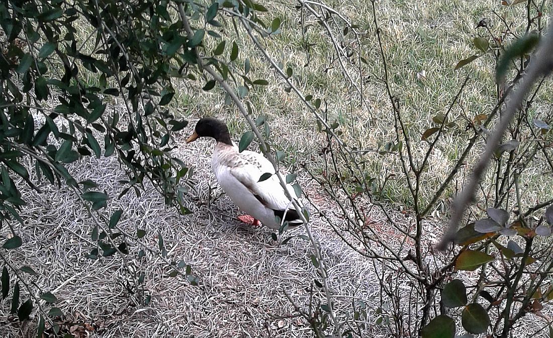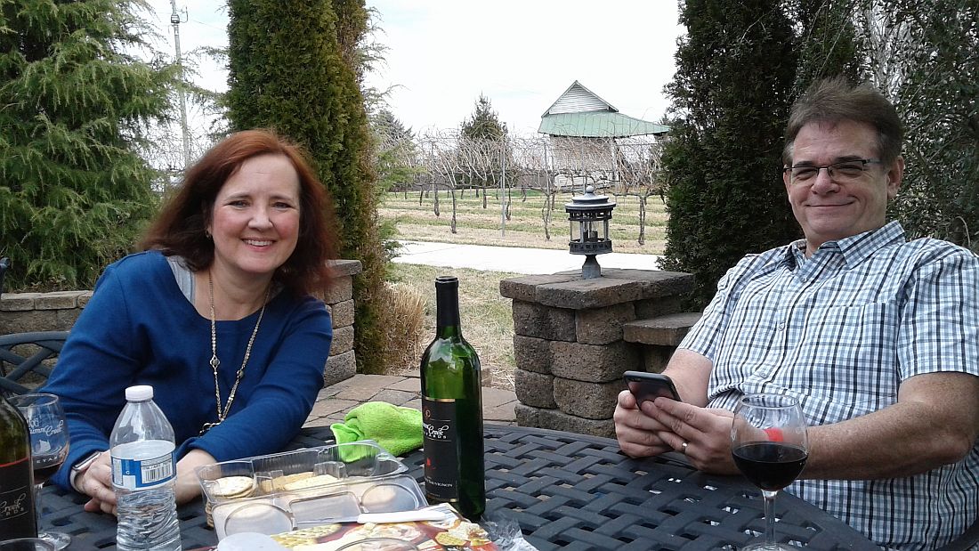 , which I had watched not long ago, though it had been many years for Ms. Brugger. I do rather enjoy it, apart from the annoying characters.After the usual morning errands with Mum, Brugger and I headed down to Autumn Creek Vineyards, where we met Joe & Suzy Albanese for another happy spot of wine and stimulating conversation (a bit political, but spirited rather than ugly). One of the highlights here was a visit by Winery Duck, who made quite a few friends out on the patio. Autumn Creek's logo is a graphic of a duck butt with "Bottoms Up" imprinted on it.