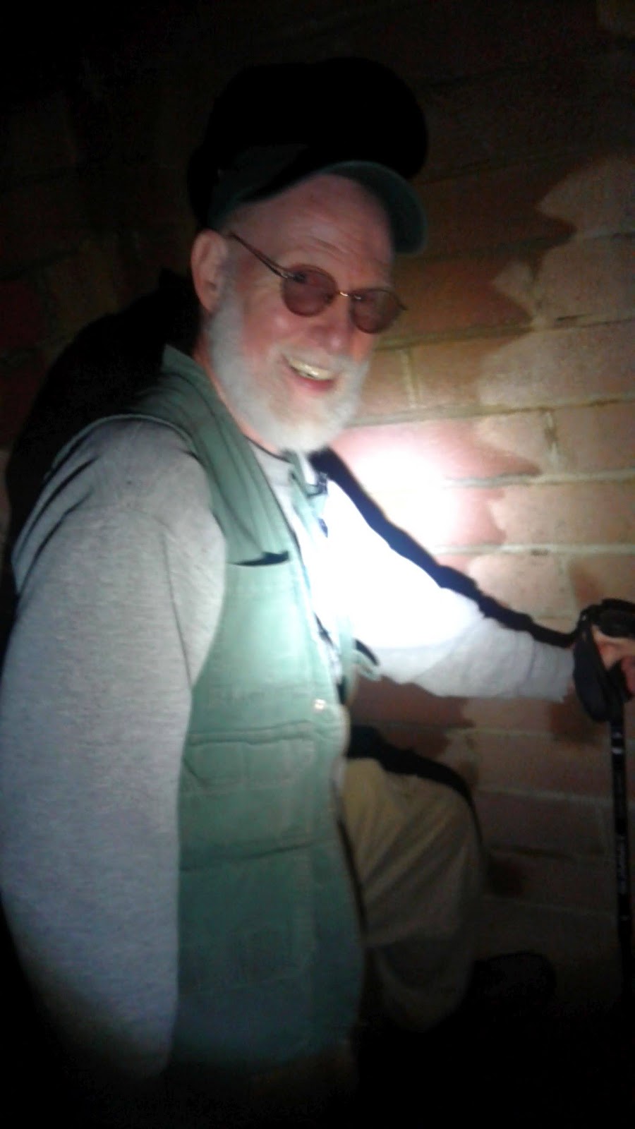 Well, that was a hoot. Four Old Farts gathered early this morning for geocaching on and around the American Tobacco Trail in Durham. Bloody Rob, Yoda Rob, Diefenbaker, and Old Rodan began with a couple of quick traditional caches in a crazy busy shopping area, but then we had to adjust our elevation to go after one of Vortexecho's (a.k.a. "Gone 2 Far") ubiquitous underground culvert hides. Just to get to the entrance, we had to hack our way through a veritable jungle of briers — that nasty, tiny, barbed type that cling to you like Velcro, shredding your skin and clothes until you somehow separate yourself from the little bastards. Bloody Rob was not the bloody one today, though, because I went first and did most of the clearing of the passage to the tunnel entrance. This resulted in considerable bloodletting and the occasional hollering for Mom that would have surely prompted Mom to clap her hands over her ears and sing "La, la, la, la, la!"