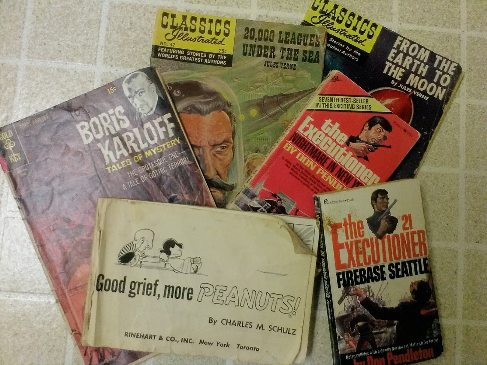 As I'm having to spend more and more time with my mom, going with increasing frequency to my old hometown to care for her, I find myself growing very protective of those old things in the house that still remain from my childhood. There aren't that many, not like there used to be. There's a small corner of the attic with a few toys, books, artwork, and other miscellaneous objets d'arte that belonged to my brother and me, some going back to our pre-kindergarten days. In the back room on the main floor, Mom has graciously saved a bunch of barely intact books that I valued as a kid — I am now mighty glad they didn't get chucked out along with so much junk over the past few decades. That photo you see above is a fair representation of my "literary" appetites at about age twelve. Of course, that's just a tiny sampling, as I became a voracious reader the moment I managed to comprehend two consecutive sentences. Everything from James Bond to Alfred Hitchcock's Three Investigators to Mad magazine to Whitman's Big Little cartoon books to Robert Heinlein and Arthur C. Clarke. A regular borgasmord, to quote a young Mason Reese. (You remember him, right — the ugly little red-headed dude in the Underwood Deviled Ham commercials from the early 1970s?)It's been a stressful few days for me, what with Mom's condition always preying on my mind, and out there in the world, bedlam reining perhaps a bit more than usual. You've seen the meme, I'm sure, that reads "My desire to be well-informed is at odds with my desire to remain sane." That's pretty much it. It's depressingly difficult to find even slightly unbiased coverage about events in the world, particularly since every soul alive has an outlet to air his opinion, whether measured and well-informed or vicious and ignorant. I stubbornly remain connected via Facebook since it's the handiest tool for keeping up with the people with whom I most want to. Still, at the best of times, my blood pressure runs a little high, even when on meds. I've come to the conclusion that ordinary bedlam raises it to around 140/90, whereas Bedlam + Facebook = BP 180/100. Bedlam needs to take a breather.