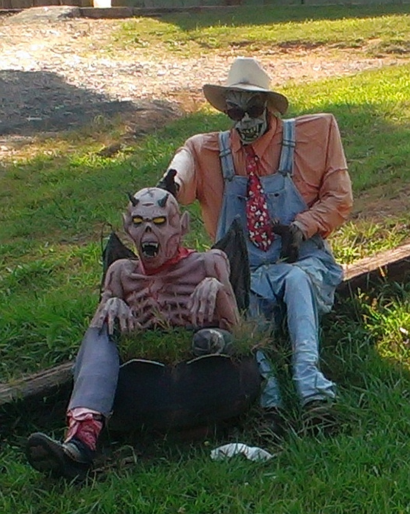 To kick things off on an apt note, as I was coming into town via the back roads through Sandy Level, I found that the Sandy Level Creep (see "Bold Moon and the Sandy Level Creep" and "The Creep's New Threads") was not only decked out in a new outfit, he had made a friend. What a cheerful duo, these two. As you can see in the photo, they're guaranteed to make passersby feel all kinds of warm and welcome.