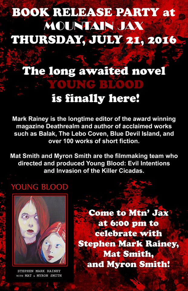 , made by brothers Mat and Myron Smith. The official novel release party is coming up on Thursday, July 21, at Mtn' Jax Restaurant, 45 E. Church St., Martinsville, VA 24112 at 6:00 PM. Both the Smith Brothers and I will be on hand, possibly along with members of the film cast, and there will be plenty of copies of the novel available (paperback, $14.99), which we will happily devalue with our autographs. The book also features illustrations by Myron Smith. Make plans to come around for a shocking, horrific, bloody awful time of it. We'd be happy to have you.I also plan to have copies of the novel available at ConGregate in High Point, NC, on the weekend of July 15–17.