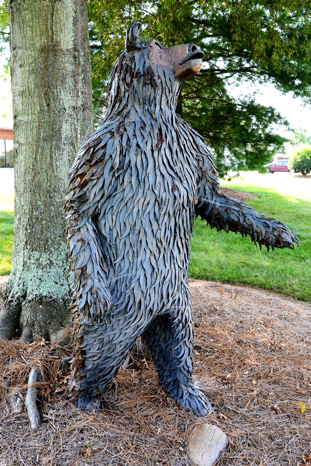 October 28, 2008. It was a cold, dreary, foggy night, fitting for the Halloween season, and I was out with my (now ex-) wife, commonly known as Mrs. Death, for some after-dark caching, which was one of our favorite activities. Among our stops was a cache in the High Point area called "The Nut 'n' Honey Pot" (GCZKNK), about which we knew nada. Our Garmins led us to a little office complex off Gallimore Dairy Road, and once we parked and made our way into the darkness, we saw something that froze us in our tracks: a big honking bear... a big honking metal bear, with razor-sharp claws, standing next to a tree. Yep, that was our ground zero, so we decided to commence our search while trying our best not to disturb the beast.