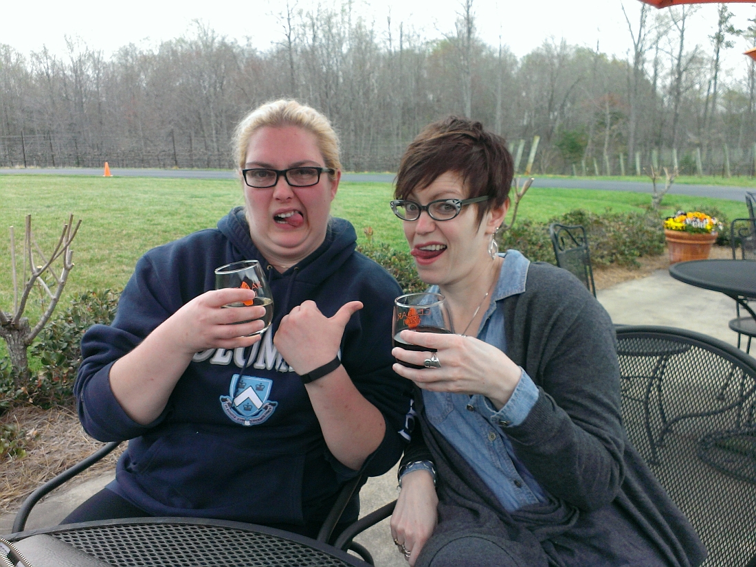 They only have a couple of dry reds — a reserve Merlot and a Cabernet Franc — but they're both exceedingly good for NC wine, and even a couple of their whites weren't too ugly on my palate. Their oaked Chardonel was actually smooth and buttery enough to make me consider having a glass of it. That is all kinds of different, my friends. Now, Ms. B. is all about stainless steel–aged, crisp-and-citrusy, non-oaky white wine, but everyone is entitled to at least a few minor shortcomings. Alas, there were no llamas in evidence this visit; just a lot of bumbly bees and a few children. (Parents, cut that the fuck out. Wineries are for adults.)From there, we went over to nearby Cellar 4201, which is a decent enough place, with more choices of dry reds. However, their tastings are way overpriced — $9 for seven wines (with a very small quantity of each wine — about half an ounce) in a stemless glass, or $15 for the same seven in a stemmed glass, which you get to keep. Please! Now, I certainly prefer a glass with a stem, but good lord, you wouldn't even get a half glass of wine for your $15, and the last thing I need is another tasting glass to bring home. For comparable wine tastings, most Yadkin Valley wineries charge you from $5 to $10 for up to ten wines, and more often than not, you get to keep the glass anyway. I confess this little bit of gouging irked me, but it wasn't hard to make the best of things, what with the company and everything. Bottom line is, with so many wineries in the area that offer you a better deal (and some with better quality wine), I am not much inclined to make 4201 a destination to revisit in the near future.