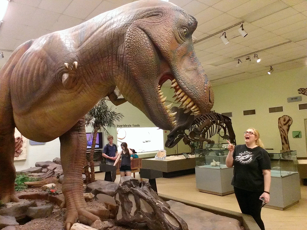 Kidlet came into town from New York City last week, and she's staying with me this weekend. She wanted to see the Greensboro Natural Science Center, as she hadn't been there since she was a wee youngster and it was a single building with just a few displays — and except for hunting geocaches on or around its premises, I've never been. It's now an extensive, multi-million-dollar complex, with lots of live animal displays, dinosaurs, rocks & minerals, aquariums, and a treetop rope course (which Allison did not care to do, but I'm quite sure I want to give it a go).