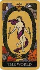 If The World is your birth card, you will get to experience victory over obstacles and the freedom of infinite potential. This is the card of dreams coming true and finding solutions to your problems. It is a kind of happy ever after card. The shadow side of The World means that you may get so lost in the big picture that you forget to tie up the loose ends and find that your energy is dissipated in a hundred projects that never get off the ground. The promise of The World is completion and joy, so know that you have what it takes to finish everything that you start, to be successful and find happiness.