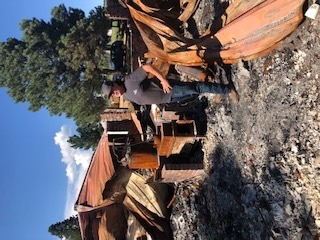 If there was any justice left in the universe, Randy was certainly due some. Though the wildfire took out his home, it spared the chicken coops (900 baby chickens were lost to the April cold because power was lost for weeks and his heaters couldn’t operate), two other houses on his property, and most of his farm equipment. The mercurial behavior of the fire was apparent everywhere. A bone-jarring ride in Randy’s ATV throughout the Manuelitas Creek area and along county road A4A revealed house after house burned to the ground interspersed with a house that was untouched. Hillsides and ridgelines were nothing but blackened pegs of needleless ponderosas that would alternate with pastures later made verdant by the floods.