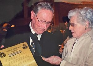 Joe and Betty DwigansAlthough Joe retired from the Navy over fifty years ago, his Navy service remains a source of pride and accomplishment. He has been an active member of the Naval Reserve Association, helping sponsor University of Kansas Navy ROTC graduates as they embark on their Navy careers. He’s also been active in the Military Order of the World Wars, sponsoring high school students from the Kansas City area to attend leadership schools in Oklahoma City. He’s also the oldest living naval aviator in the Kansas City chapter of the Association of Naval Aviation.