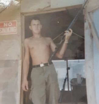 Kenny with the South Vietnamese countryside behind him.Because Kenny was a supply clerk, his daytime duties at Phu Bai initially involved managing the supply records for the uniform inventory in support of the Property Book Officer. After two months, though, he was so bored that he went to the Property Book Officer and said he needed to do something else. Appreciating the initiative, the Property Book Officer sent Kenny across the street to the battalion ammunition (“ammo”) dump to talk to the sergeant in charge. When the sergeant heard Kenny wanted to work in the ammo dump, which supplied small arms ammunition to infantry companies in and around Phu Bai, the sergeant just shook his head and told Kenny to come in and get started.