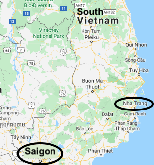 Map of South Vietnam showing Saigon and Nha TrangJohn flew his initial C-130 missions as copilot, helping qualify him to fly later as the aircraft commander. That opportunity came on a mission hauling sandbags from Saigon to Da Lat, which was up in the mountains. John recalls there was extremely limited visibility and is certain that had it not been for the skill of his navigator, they would have abandoned the mission. Instead, they broke through the clouds a mile from the runway and made a routine landing on what had been a perilous flight. From this point on, John would fly as an aircraft commander.