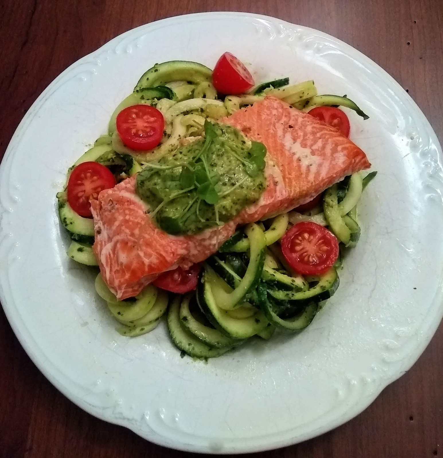 A simple "whole-made" meal in under 30 minutes. Wild-caught salmon on top of organic zucchini noodles that were lightly sauteed in avocado oil and tossed with a homemade, dairy-free, orange-basil pesto made with pistachios instead of the usual pine nuts! A few organic grape tomatoes, a spoonful of pesto, and a pinch of arugula microgreens finish the dish. Simple to make and loaded with protein, healthful Omega-3s, and fresh, colorful carbs!
