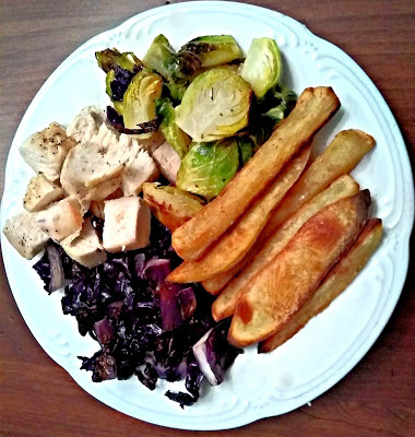 "Whole-made meal" using these amazing organic, seasonal ingredients. Free-range chicken, Brussels sprouts and white sweet potatoes roasted in virgin coconut oil, with sauteed purple cabbage. A few minutes of prep work, a pinch of sea salt, and you're done!
