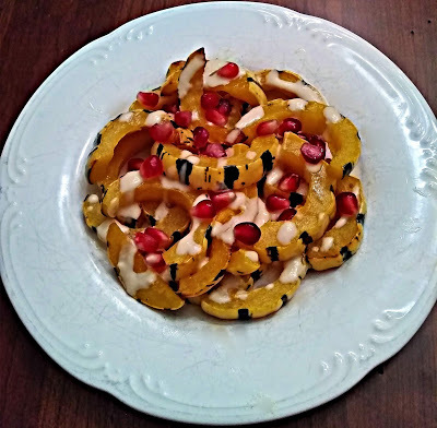 "This dish captures fall on a plate! Roasted organic delicata squash, drizzled with a homemade lemon tahini sauce, and topped with antioxidant-rich pomegranate seeds.