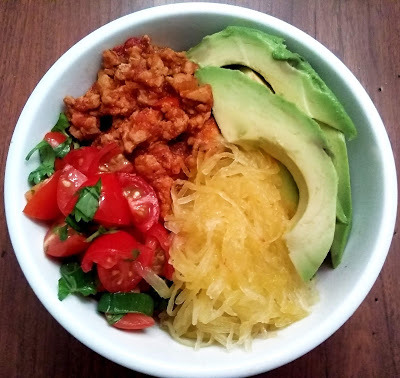A bowl of comfort food on a cool fall night filled with homemade turkey chili, spaghetti squash, a quick pico de gallo made with tomatoes, cilantro, green onions, lime, and a pinch of sea salt, and of course avocado!
