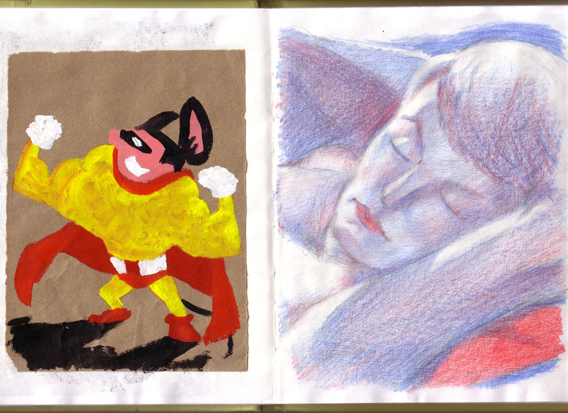 Pensando en diarios íntimos, leyendo 'El discurso vacío' de Mario Levrero es imposible no pensar en eso. Mirando mis cuadernos de bocetos y apuntes. Son un diario íntimo también. Paso las páginas, veo los dibujos y recuerdo en qué andaba. Cómo estaba. Con quien estaba y con quien no. Si lo hice triste, contento, furioso, tratando de escaparme o festejando algo. Aún cuando la memoria esquive el recuerdo, y no me pasa muy seguido, está la sensación clara. En las líneas digo, por eso de dibujar con el cuerpo y la mente, noto mi ánimo del momento.Pasa, claro, con todo lo que dibujo. Pero en el caso de un cuaderno de bocetos (libreta, hojas sueltas en sobre, carpeta o cajón), es más evidente. Porque es eso y nada más. No media el oficio, la fecha de entrega, el encargo, nada.