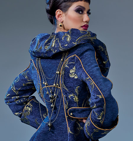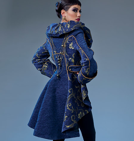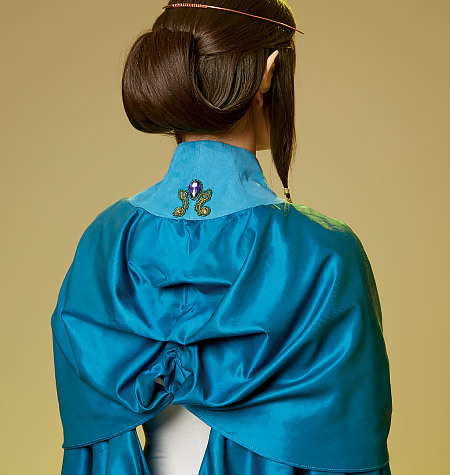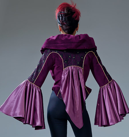 Eventide is the sort of coat you may expect to see on a fantasy noble or sorceress, frilly, fancy, and regal. There are two back drape variations, and two sleeve variations, including one with long drapes.With the right detailing, you could easily give this a steampunk flare. The tips section on the inside sleeve explains how to add jewelry embellishments and couching with a chain. Do you have any old steampunk jewelry you'd like to repurpose? Any interesting gears? Any mechanical animal pendants? Use those for the embellishments.This pattern is for intermediate level costumers. Suggested fabrics include damask, silk dupioni, velvet, and satin. I'm amazed at the price, honestly. The pattern for this gorgeously complex jacket is just $14.95.