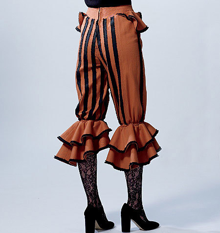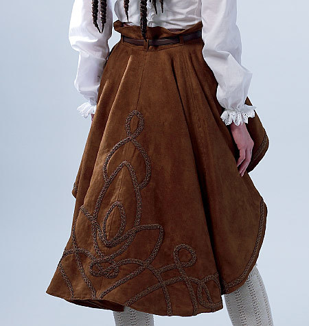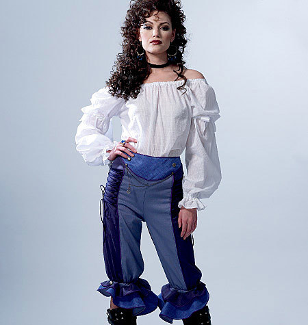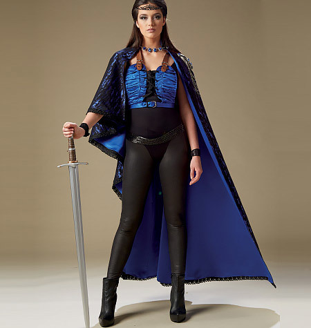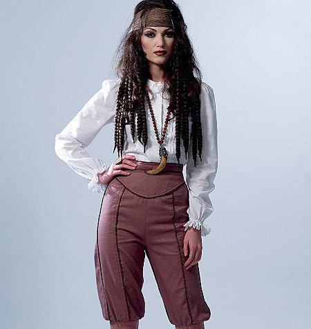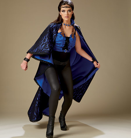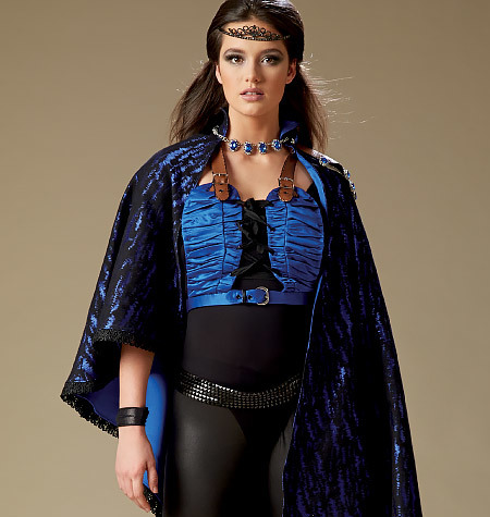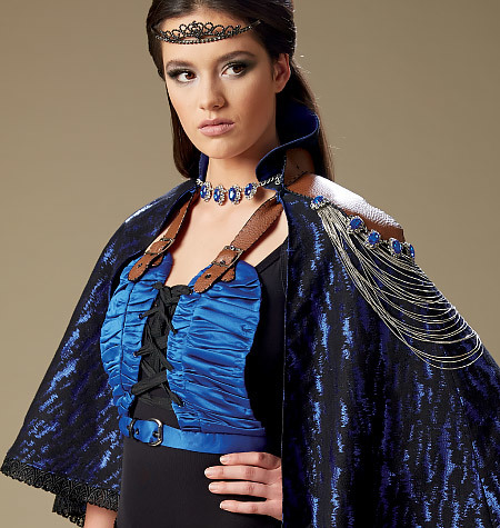 Pirates and steampunk! Sounds like a great combination to me. Wayfaress is pirate/seafarer costume for women. The pattern consists of britches, with three possible styles, and an overskirt. Suggested material includes gabardine, synthetic suede, twill, and lightweight will for the pants, and synthetic suede for the skirt.As always, make it your own with your choice of configuration and fabric, and make it steampunk. You might add gadgets and a model nineteenth century pistol to the belt. How about a compass on a chain for a necklace, or a spyglass with swirly symbols along the sides. Octopuses and squids are often associated with steampunk, so perhaps add a squid ring, or add steampunk-related leatherwork to your boots.This pattern is for intermediate level costume makers. It includes tips for trimming with various types of ribbons and on adding decorative topstitching. Wayfaress retails for $17.95 exclusively on the Cosplay by McCall’s site.