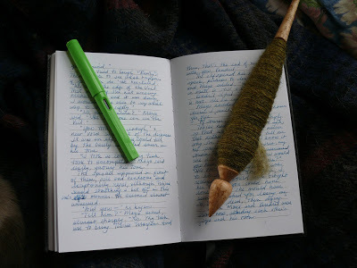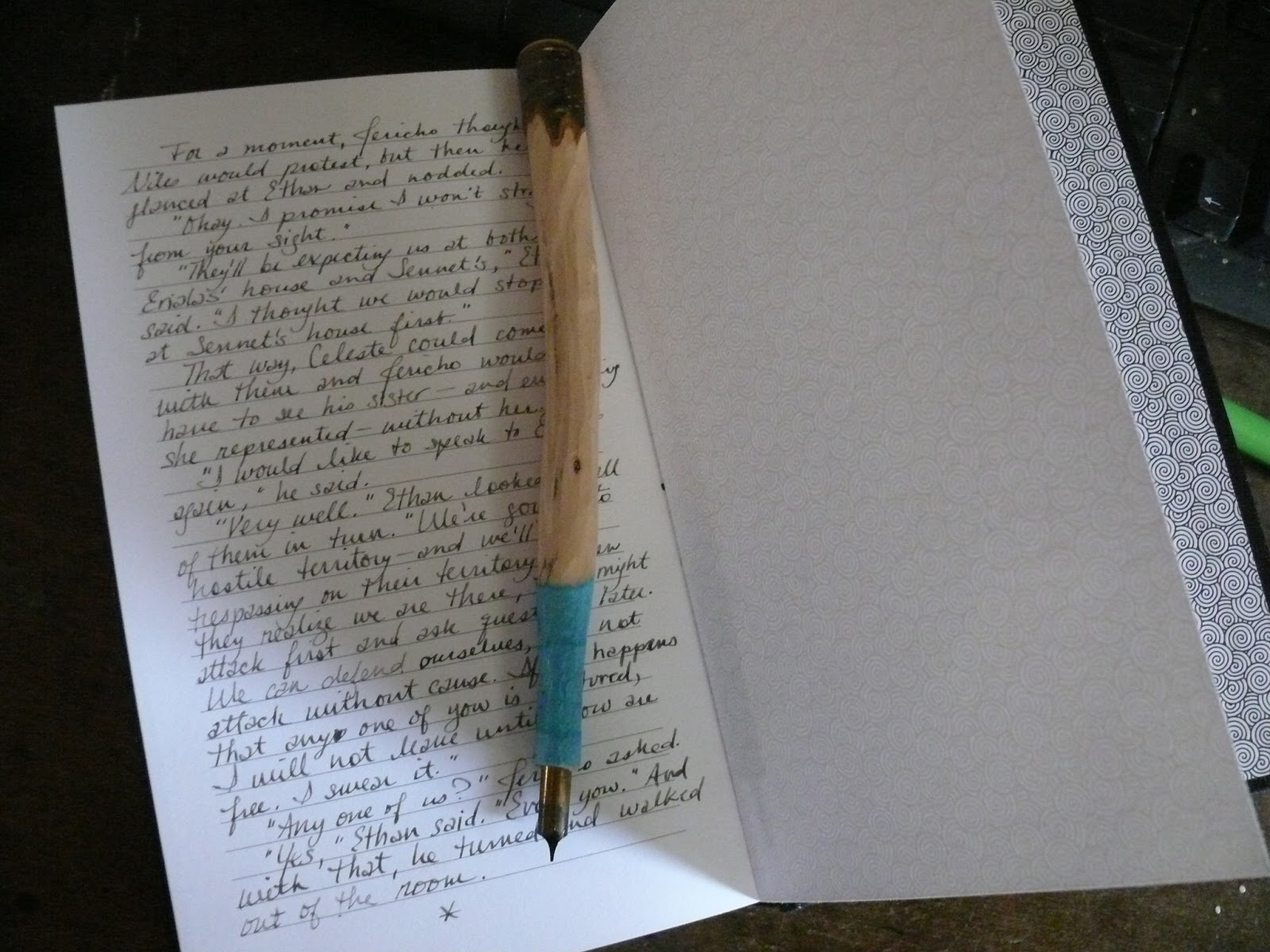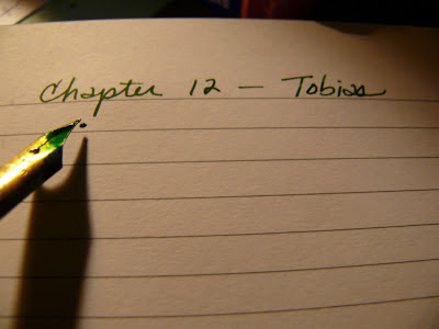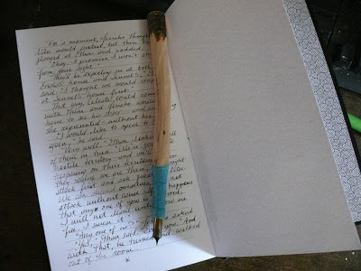 The pen in my hand, the notebook's paper beneath the faint scritch scratch of the nib, slowly filling up with words of a story I will have no ending to quite yet, although there's a scene in my mind that has been there for years that might yet appear in this story, finally.