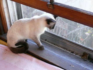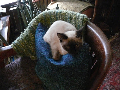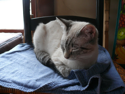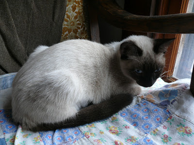 This is my chair. Early on, the kitties who live here with me discovered that they could snooze on the pillow behind my back--first Chloe Bella, then Gracie, and now, Birdie and even Oliver have all slept there. In fact, it's quite the golden seat (and sometimes fought over.)