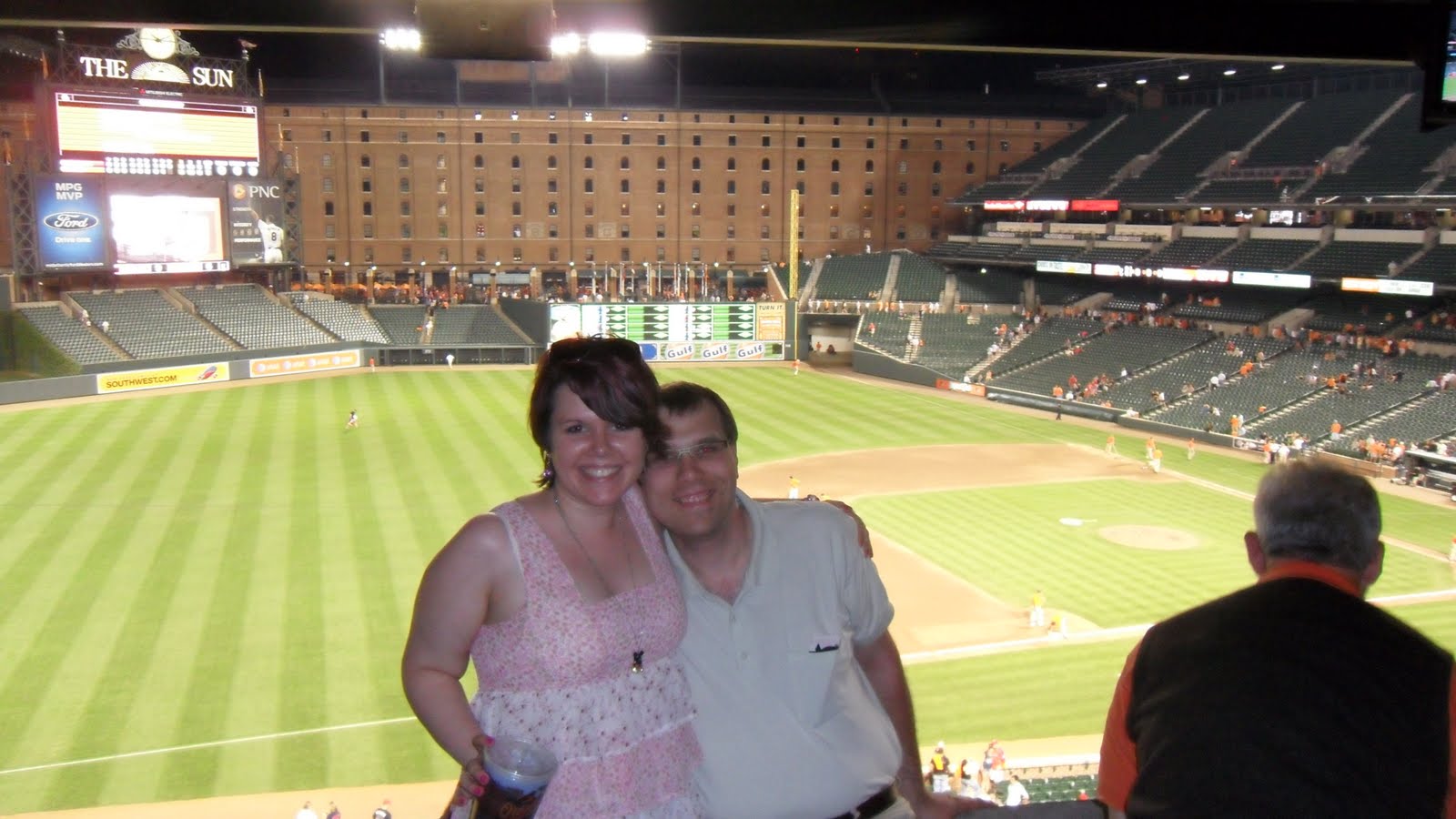 My husband (he's sitting in that pic. He's usually more than a head taller than me...lol) and I at the end of the baseball game. Orioles vs. Cardinals. That's Camden Yards in the background. The game was fun, though my husband and I don't know anything about baseball. I'm not even sure if it's being played in Germany.