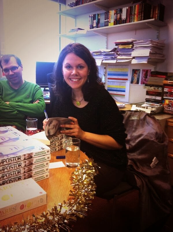 I also just returned from London where I met my lovely UK publisher Hodder. Impostor came out in the UK about two weeks ago! You can see the cover on the right side. Here's a photo of me signing copies in the Hodder office.