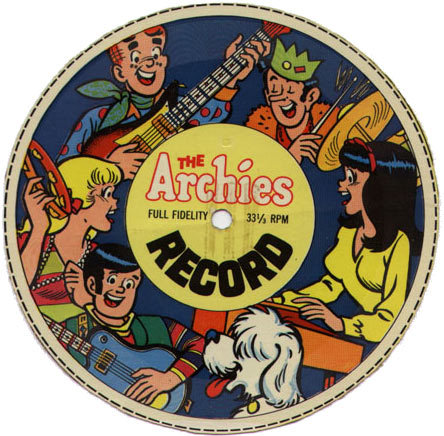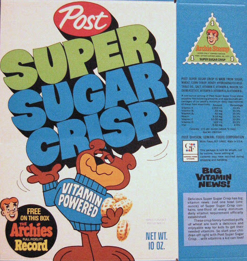 One of my earliest memories is of a cereal boxSuper Sugar Crisp, now called Golden Crisp—with an actual, playable cardboard ‘flexi record’ printed on the backside. My mom had just taken the box from the grocery bag, and it sat on the kitchen table, waiting to get stored. At age 4, I was already a music fan and pop culture scholar in the making, so I was both fascinated and excited. Still a preschooler, and so not great with scissors, I enlisted by big sister’s help in cutting the record from the package. I’m guessing the box, missing most of its backside, ended up in the cupboard. The small album, featuring brightly colored images of Archie and the gang, played at 33 1/3 speed and had 4 songs from cartoon band, The Archies, including one of my favorites, the mega-hit, Sugar, Sugar. The flexi-record stayed on my family’s turntable for at least a day. Which, in little kid time, is forever.