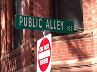 Yep, these alleys have street signsAfter walking up and down that section of the street enough times to bring attention to myself Susan and I circled back toward the library. And then we saw the back alley complete with street sign. A street sign for an alley? Why not, I guess.