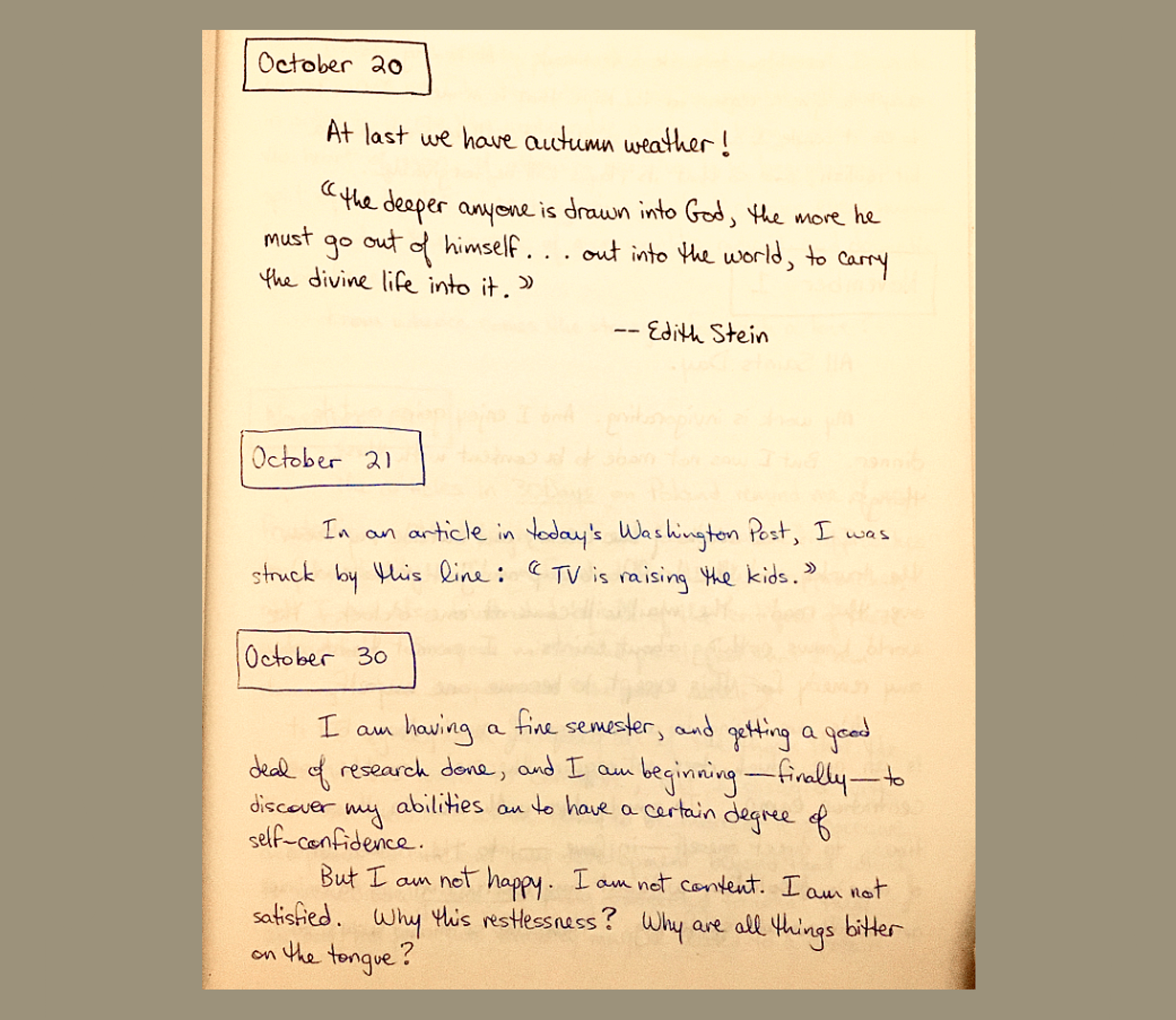 What about John Janaro in 1990? I was doing well in graduate school. "But I am not happy. I am not content. I am not satisfied." I was 27 and I thought that "all things [were] bitter on the tongue."