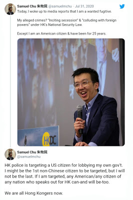 But here's where the whopper of a mistake comes in. One of the six, Samuel Chu, emigrated long ago from Hong Kong (before the handover in 1997) and has been a citizen of the United States of America for the past 25 years. In other words, the Chinese are claiming they can arrest Chu for exercising his rights as an American citizen.