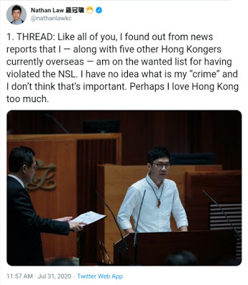 On August 1, Nathan Law — the 23 year old veteran student protester and sometime political prisoner, who had been elected to the LegCo and then unseated, and who went into exile last month — posted a statement on Twitter. May I point out that Nathan Law is the same age as my son. Many protest and opposition political leaders in Hong Kong are the age of my kids. They have carried themselves with great dignity under unimaginable pressures since 2014. As far as I can tell, they are not ideologues or rabble rousers (no doubt there are plenty of those in a very large and disorganized protest movement, but students like Nathan Law are not among them).