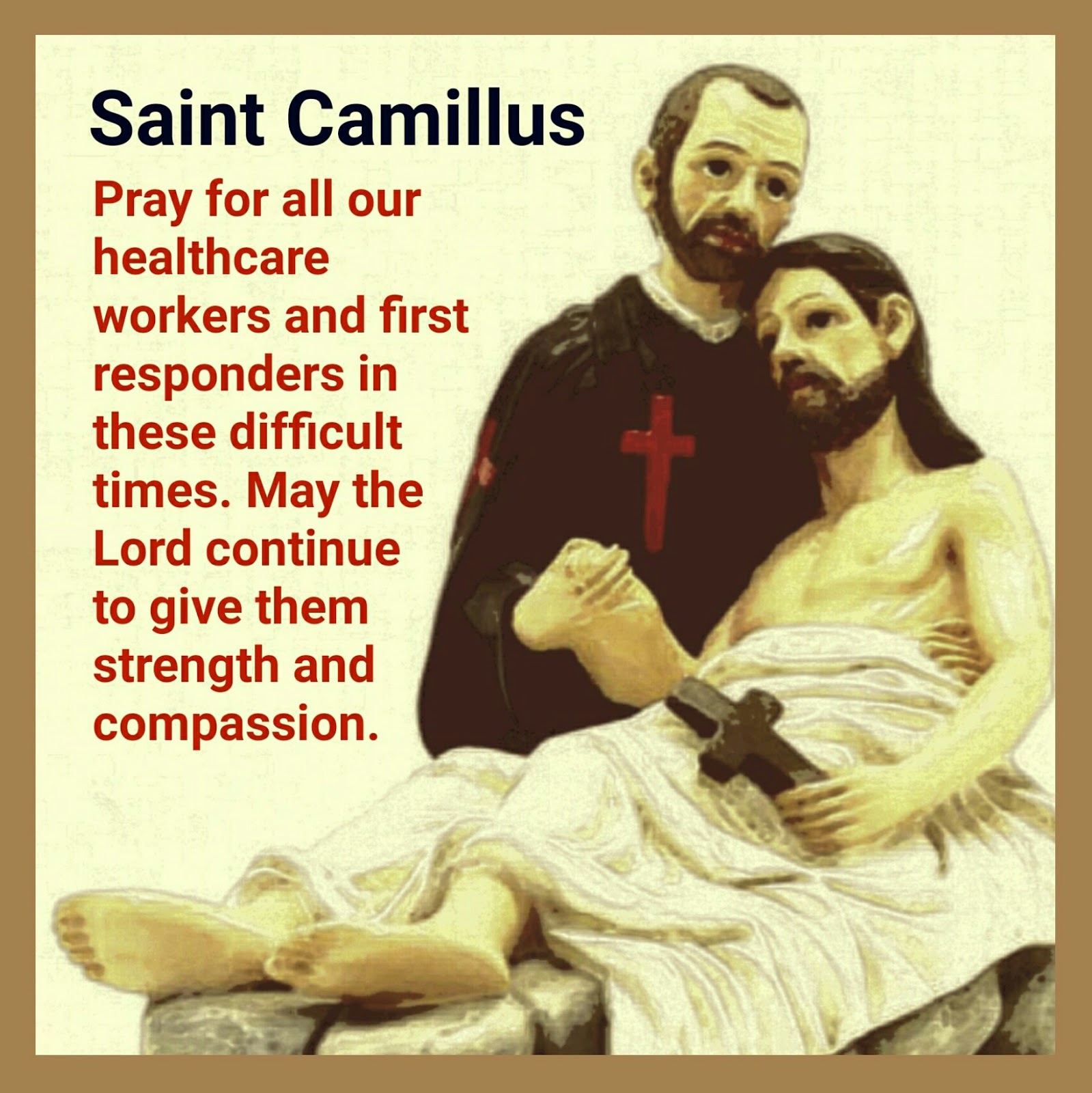 Saint Camillus, pray for our healthcare workers and first responders in these difficult times. May the Lord continue to give them strength and compassion.