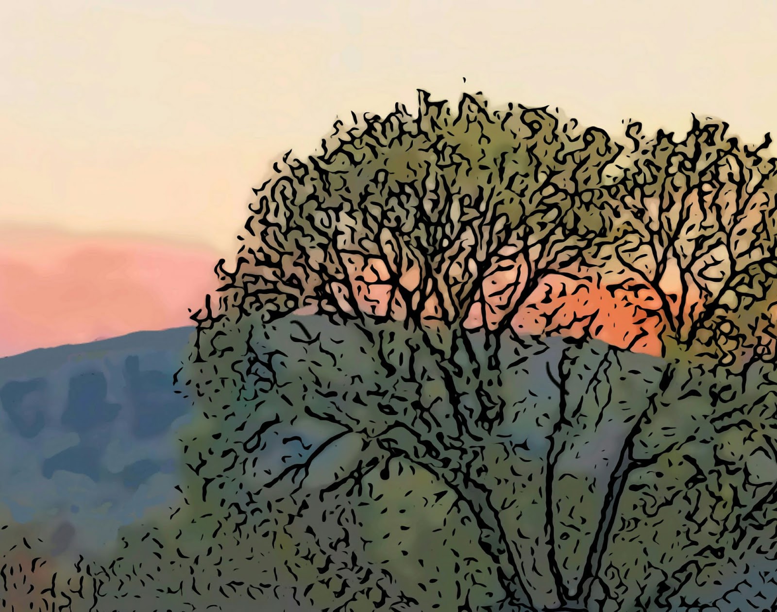 An early April evening in the Valley, with hues of bright green from new leaves, blue mountains, orange and yellow on the horizon. Digital Art by JJ.