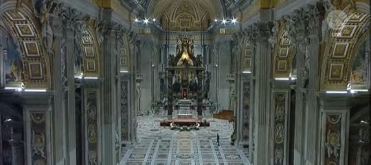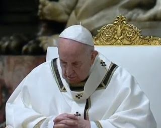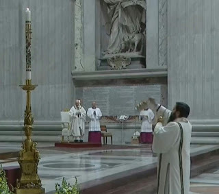 The Easter Vigil is happening NOW at St Peter's Basilica in Rome. Pope Francis, a few priests, some members of his staff, an organist and a few singers, and the Vatican Media workers - alone in the vast, cavernous church, under the immense dome.