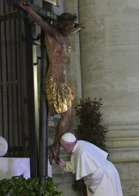 At the beginning of this service, the Pope was seen walking through the middle of the large square, alone, with rain pouring down on him. By the end he was visibly limping, no doubt from the sciatica that pains him, as he carried the monstrance with the Blessed Sacrament.