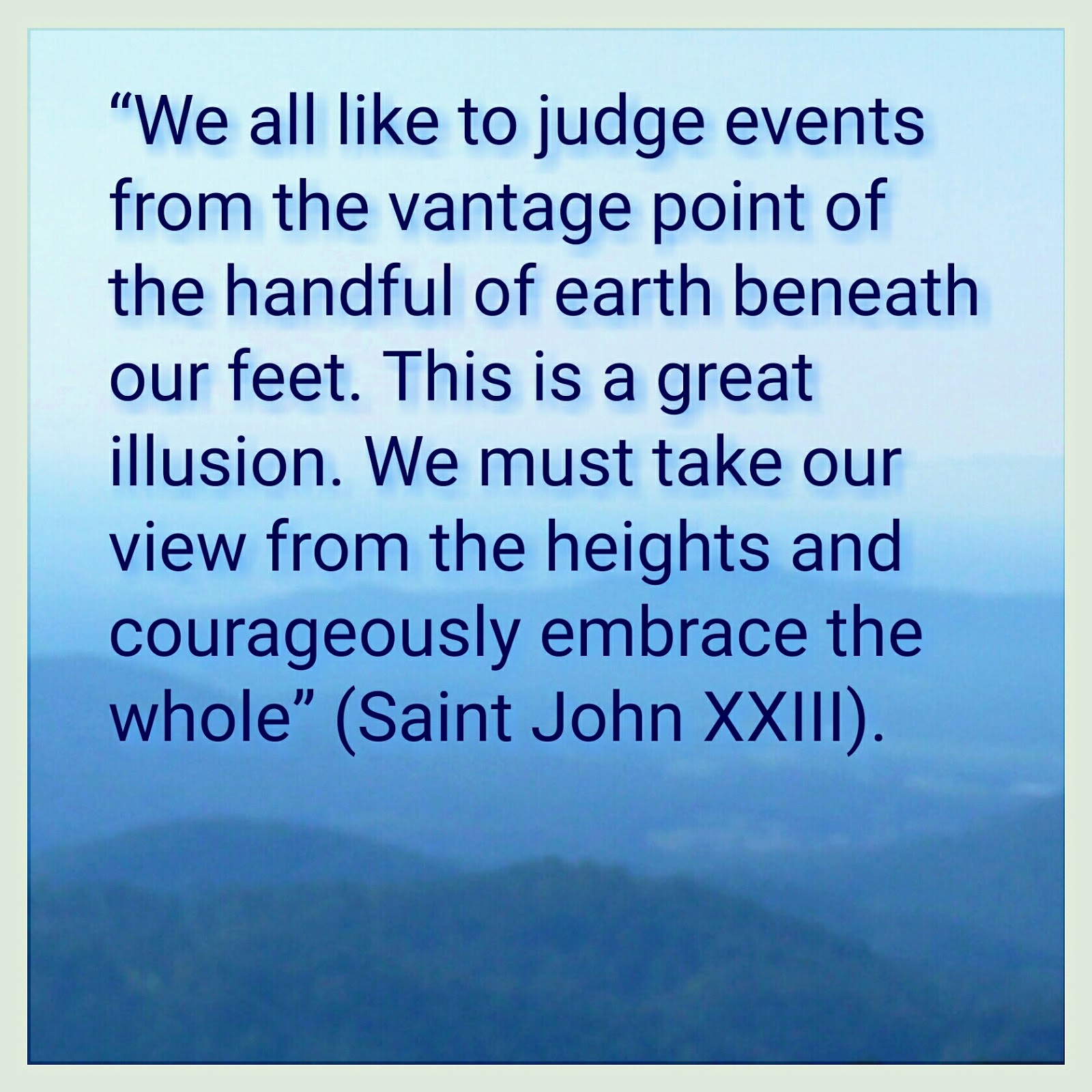 Cold hearts and narrow minds can easily turn a small perspective into "a great illusion." Saint John XXIII insists that "we must take our view from the heights and courageously embrace the whole."