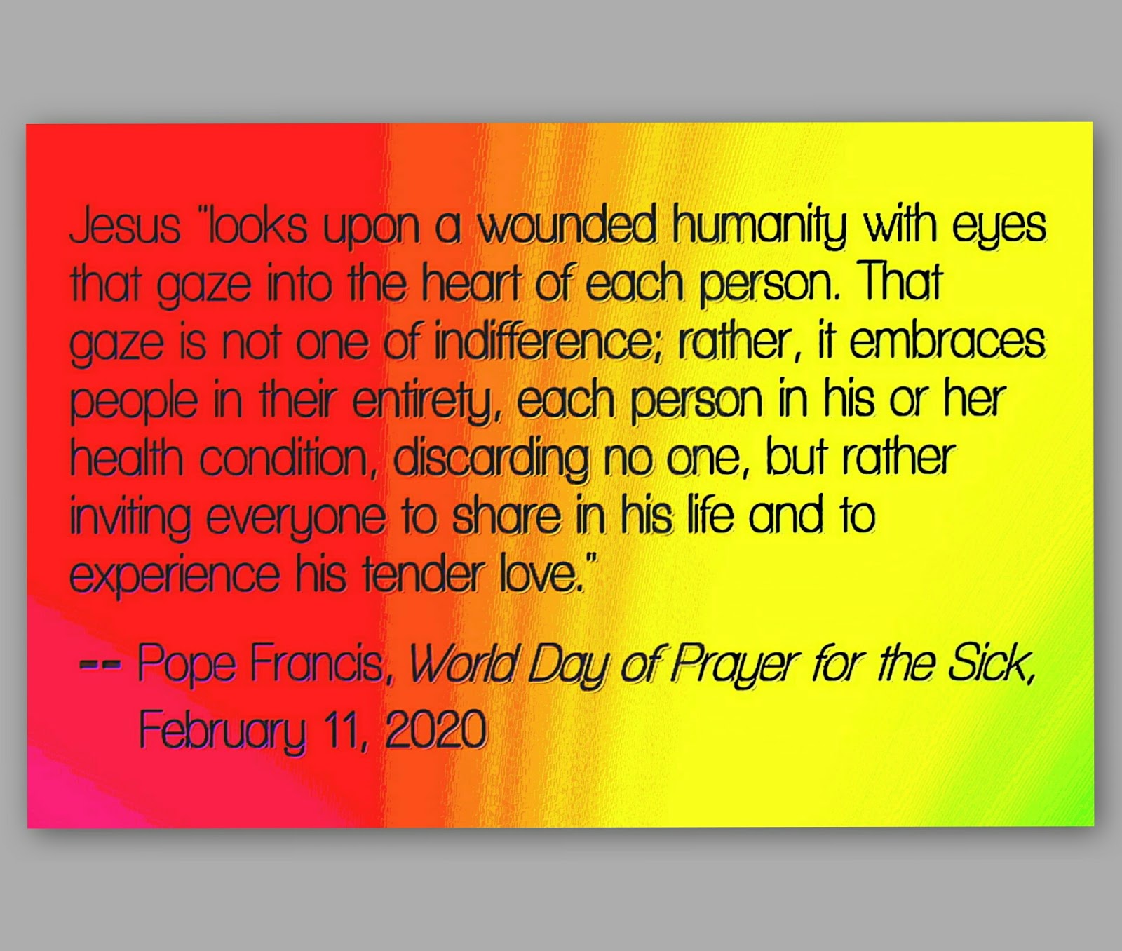 In any case, the words of Pope Francis for this feast day of Our Lady of Lourdes mean a lot to me. As someone who remains one of "the sick" (a fact that still hinders certain aspects of my life), I am grateful to be reminded again of "that gaze into the heart of each person" full of healing and "tender love."