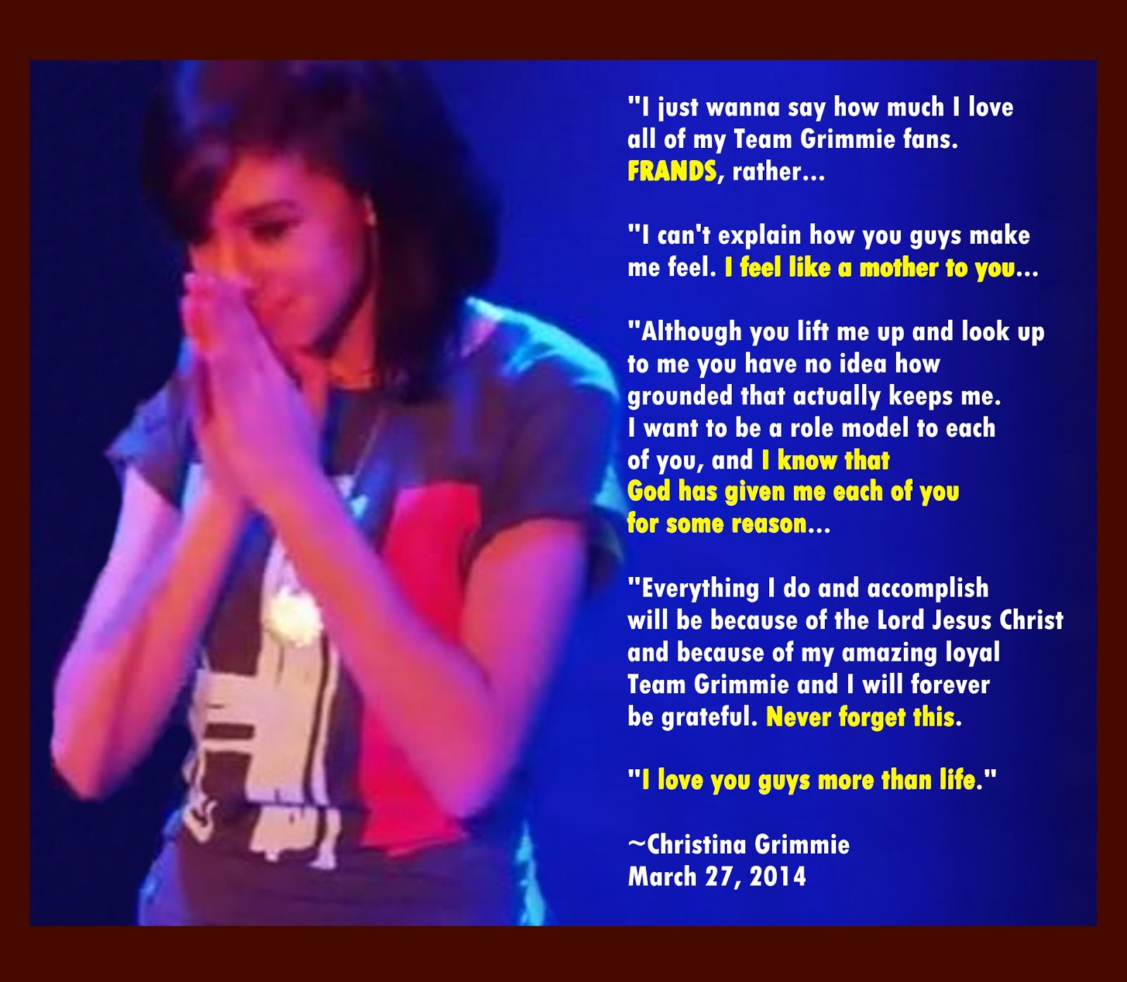 Two years prior to that fatal night, she wrote a special note to "Team Grimmie," her frands. She said some extraordinary things in that note, and she would repeat many of them again. More importantly, her life was true to these words, right up to the very last moment...