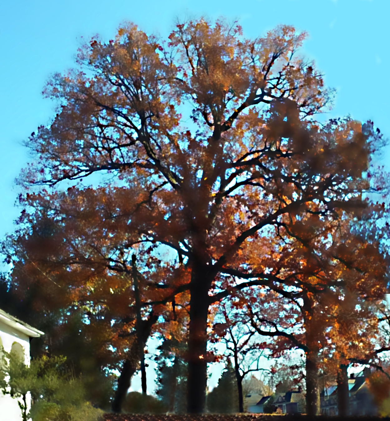 Last week there were still a few trees where the leaves had more or less dried up into a rusty brown while still on their branches. Not very good for photos, but raw material for some fuzzing and blobbing and dabbing with digital tools. This is nice: