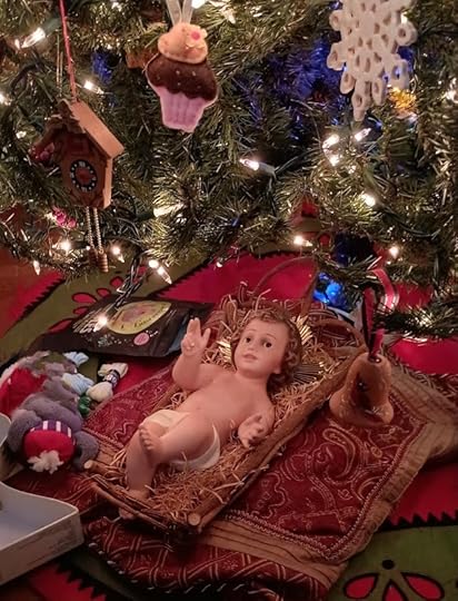 The “Baby Jesus” statue under our tree is the same one as our kids used to hold for pictures when they were little. It has endured (with only one major repair job) through the years of our family history.