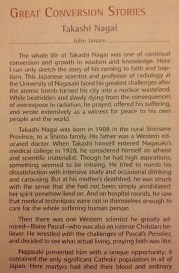 Dr. Takashi Nagai (1908-1951) was a Japanese medical doctor, a scientist and pioneering researcher who specialized in radiology, a highly respected professor, a beloved husband and father, and a convert from atheism to Jesus Christ and his Church. My article about his conversion appears in Magnificat's September 2018 issue.