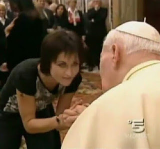 I just watched a short clip of Dolores and her family meeting Pope John Paul II (from JPII's condition, I'd estimate this took place in the early 2000s). The video looks like it was originally broadcast on Irish television news. The picture above on the left is a screenshot I took from the video—a "still image" that vividly portrays the very brief but striking moment when they were face to face.