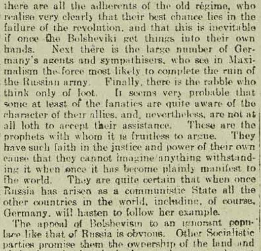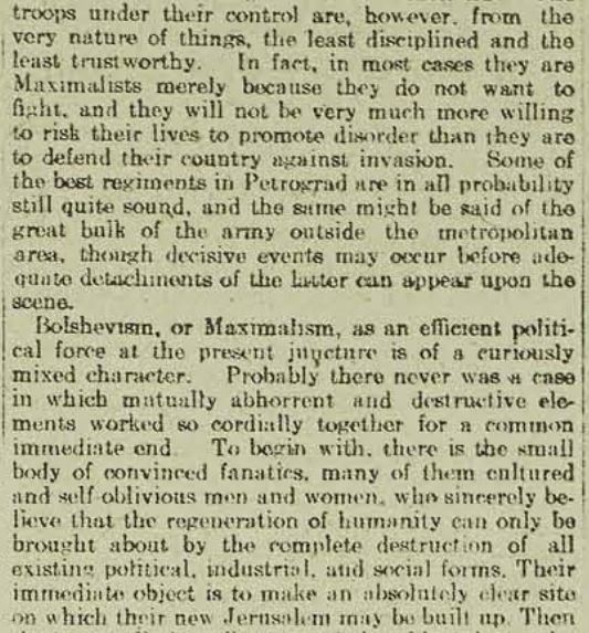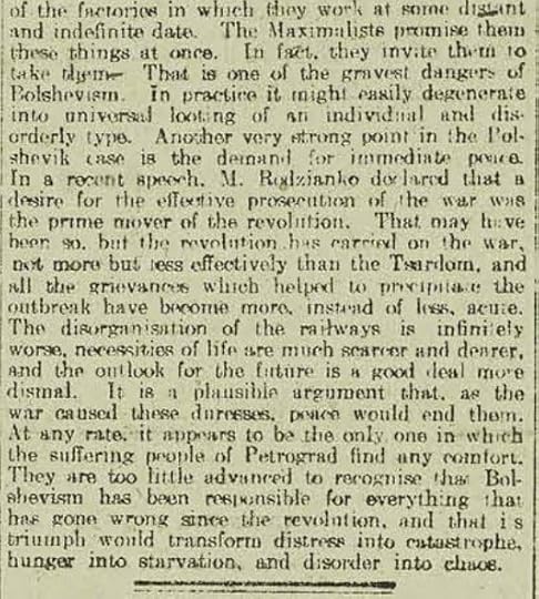 But to continue our imaginative supposition: by now you, the English newspaper reader of 1917, would have been used to hearing all sorts of crazy news from Russia since the downfall of the Tsar. How was anyone supposed to keep track of who was in charge and who was rioting? The only thing that seemed to matter was that Russia was still in the war, tying down 50 divisions of Germans (several hundred thousand men) in the East.